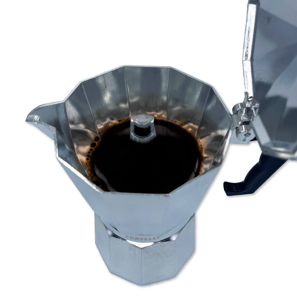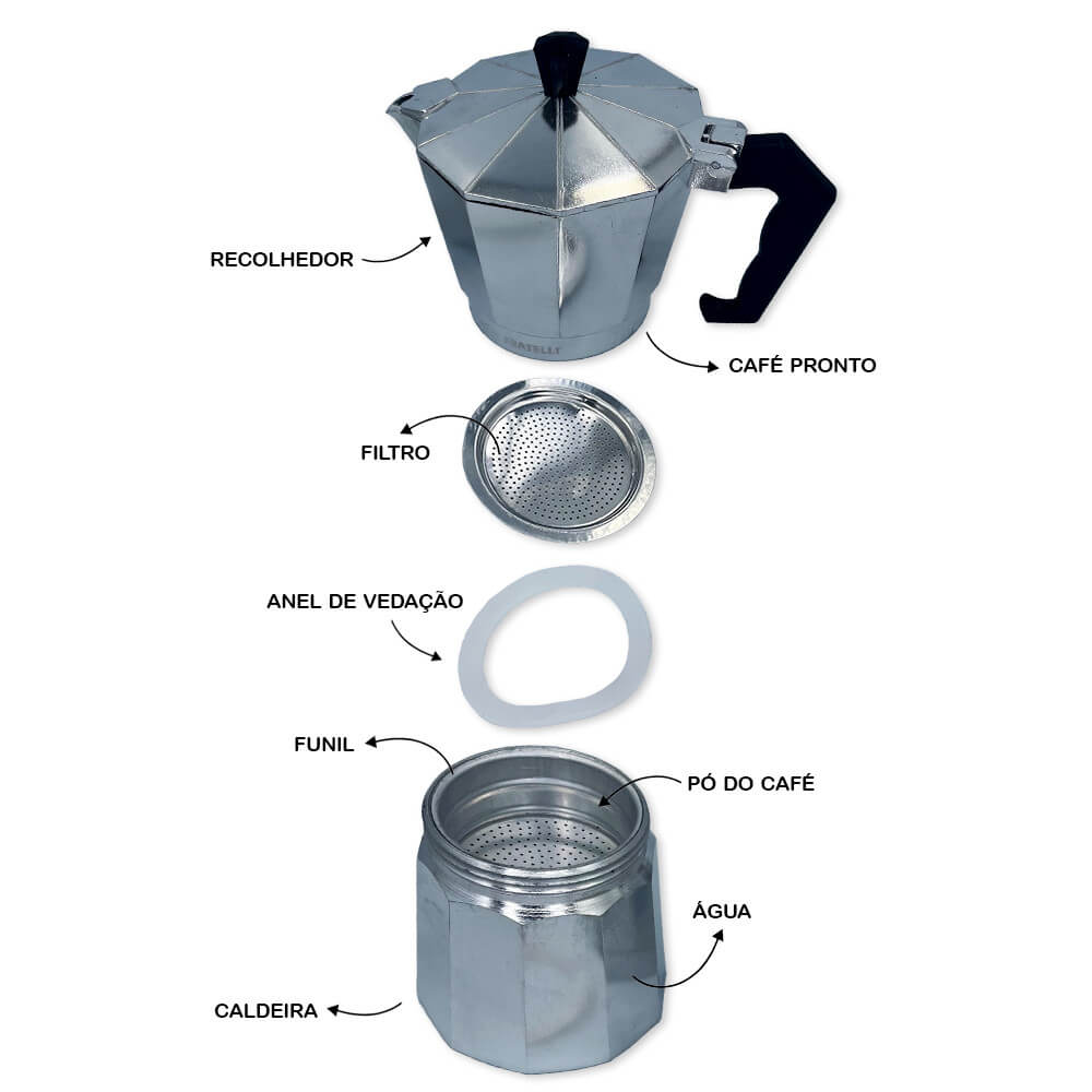 O processo de preparação do café é feito de baixo para cima. A água ferve na caldeira, passa pelo pó do café que está no funil e por fim, o café chega no recolhedor e está pronto para ser servido.
