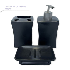 Esse Kit para Banheiro - 3 Peças deixa qualquer banheiro mais elegante, confeccionados em porcelana e acabamento na cor preta combina com qualquer tipo de bancada. Renove a decoração do seu banheiro e deixe-o mais organizado e confortável.